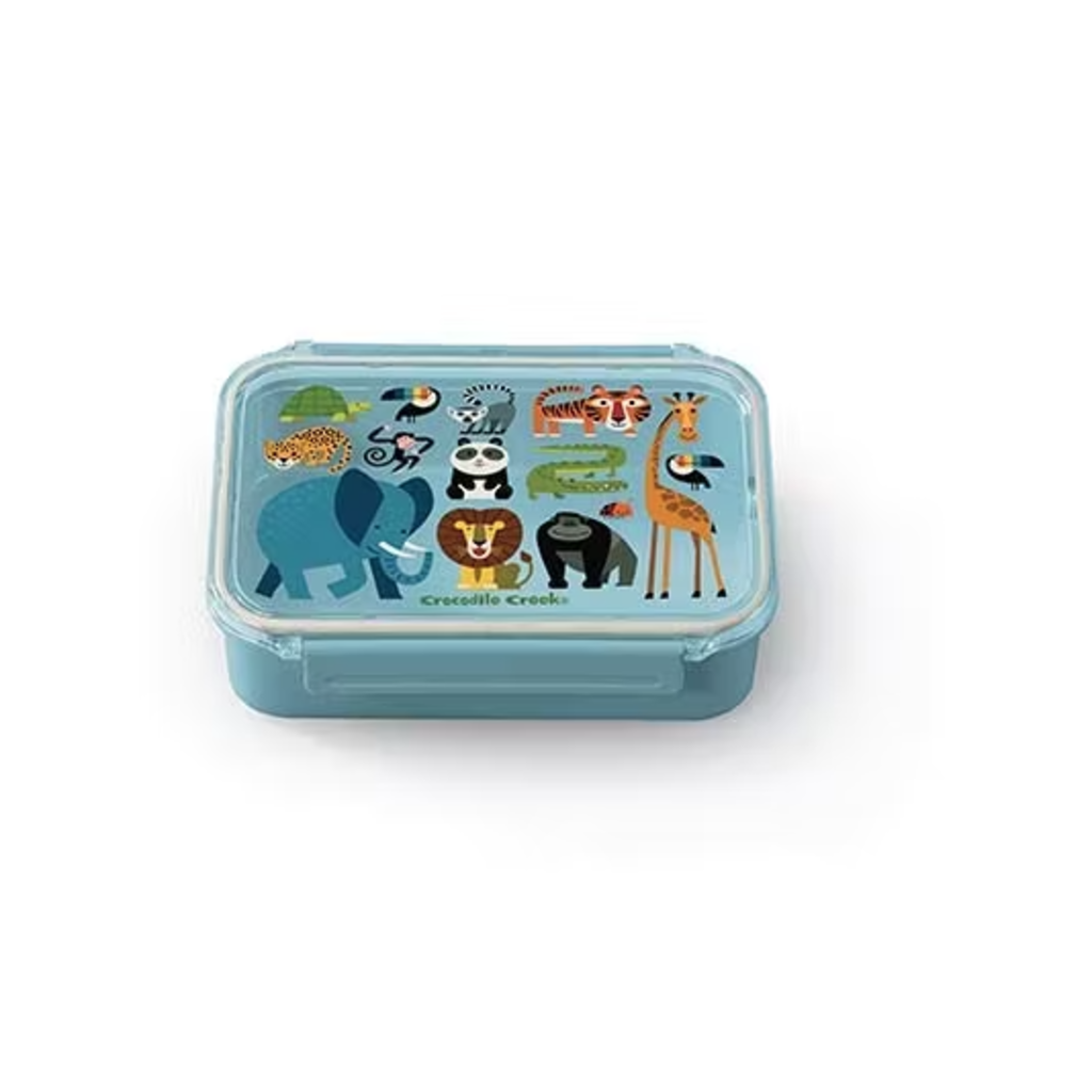 De bento box van crocodile creek is handig (lekvrije deksel), milieu vriendelijk en heeft een ontzettend vrolijk deisgn!