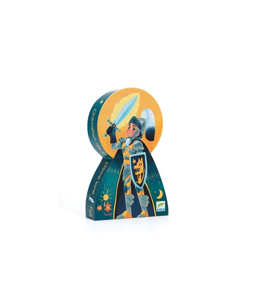 Een ridder beschermt zijn kasteel samen met zijn wolf op een nacht met volle maan. Een prachtige 36-delige puzzel in een elegante doos in de vorm van een ridder.