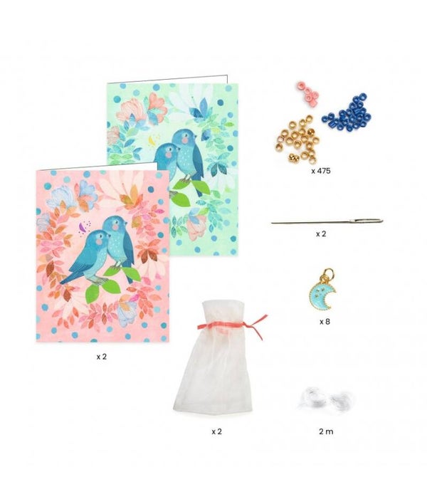Een assortiment van kralen en bedeltjes in een mooi glanzend doosje om 2 armbanden te maken. 2 sieraden om te bewaren of cadeau te doen in een zakje van organza. En voor nog meer herinneringen zijn er twee geïllustreerde kaarten bijgevoegd om lieve berichtjes op te schrijven.